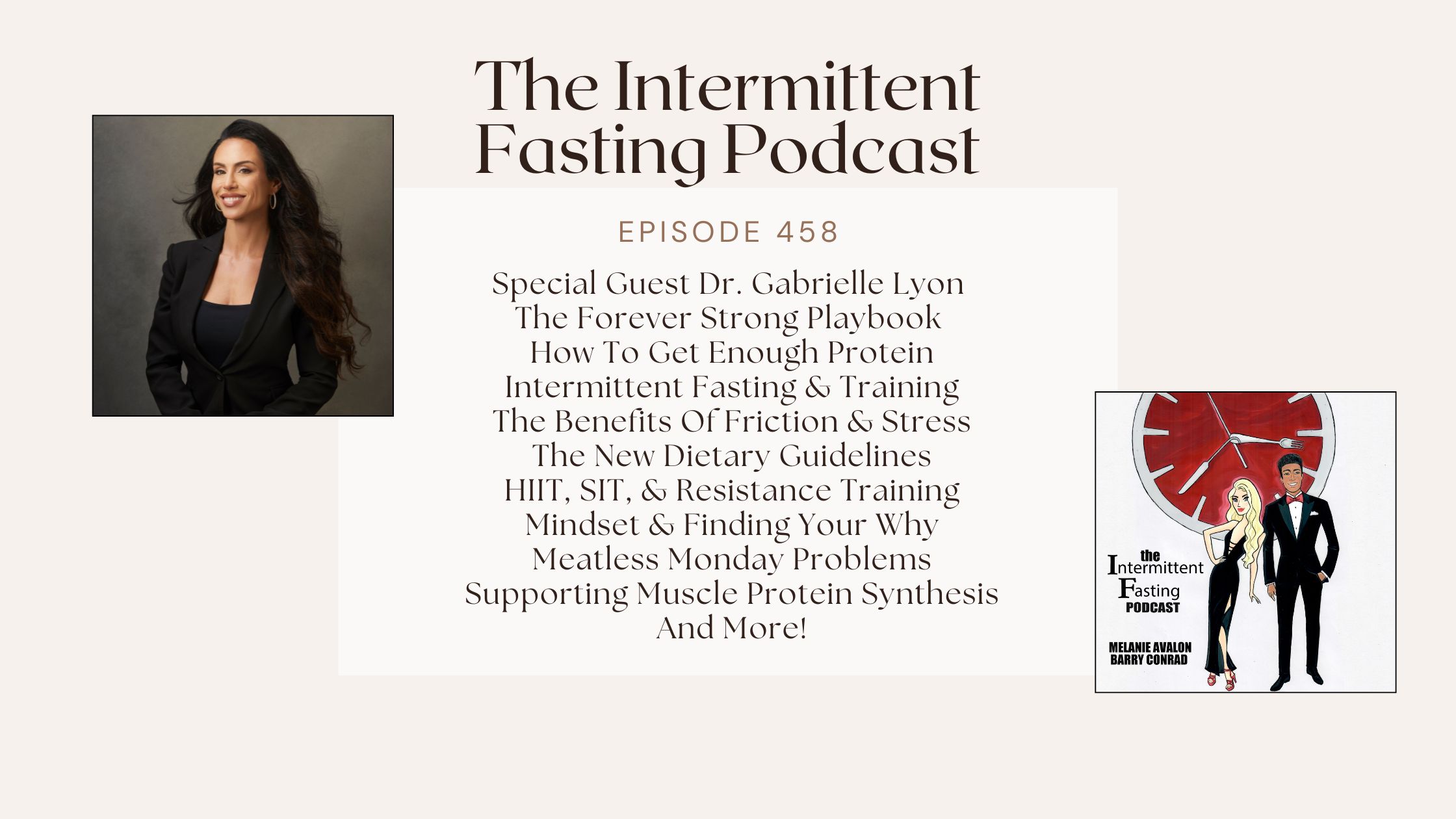 Please remember, the thoughts and opinions on this show do not constitute medical advice or treatment. So pour yourself a mug of black coffee, a cup of tea, or even a glass of wine if it's that time, and get ready for the Intermittent Fasting Podcast. Hi, everybody, and welcome. This is episode number 458 of the Intermittent Fasting Podcast. I'm Melanie Avalon, and I am here with the most special guest ever. Honestly, probably one of the most special guest in the show as well. But this woman is a legend, a legend in the world of health, especially when it comes to protein intake and building muscle and supporting your ultimate longevity. That is Dr. Gabrielle Lyon, a stunning, beautiful human being. I've had her on the show before for her work in general, as well as her New York Times bestselling book Forever Strong. And so when I found out that she was releasing the Forever Strong Playbook, I was overwhelmingly excited to dive into it and have her back. And friends, oh my goodness, get this book now. So when this episode comes out, it will be releasing tomorrow. So it's very likely that it's on the shelves when you're listening to this. So get it now. It will answer all the questions you ever had about topics that we talk about all the time on this show, which is how do you get enough protein? How do you structure your diet? How do you support your muscle? How do you have a muscle-centric lifestyle? And then not only that, how do you recover? How do you sleep? How do you change your mindset? I was talking with Gabrielle right before this, and it was perfect timing because Barry Conrad, the normal co-host of this show, sent me some questions for her. And it's funny because the first question he sent me, literally, I don't think he planned this because he hasn't read the Forever Strong Playbook. This is what the playbook answers. So his question was, Dr. Gabrielle Lyon, you often say that skeletal muscle is the organ of longevity. If muscle truly is the currency of longevity, what does a muscle-first lifestyle actually look like day to day, not just in the gym, but in how someone eats, recovers, and structures their life?